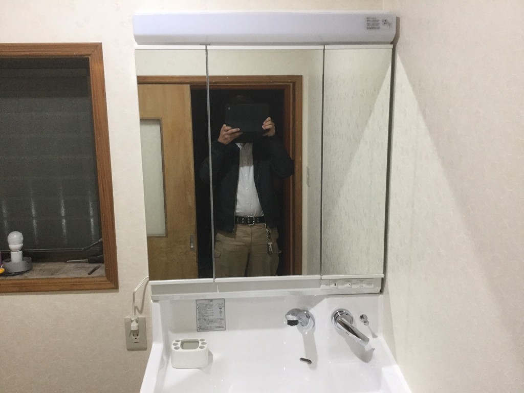 開き扉の洗面化粧台からオールスライドタイプ3面鏡の洗面化粧台への交換工事です。
