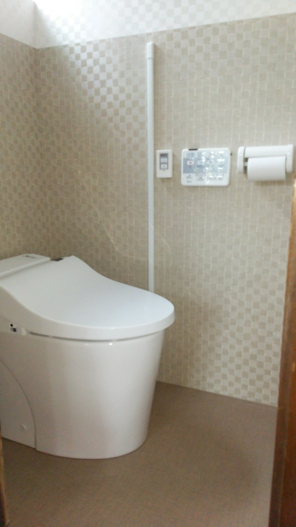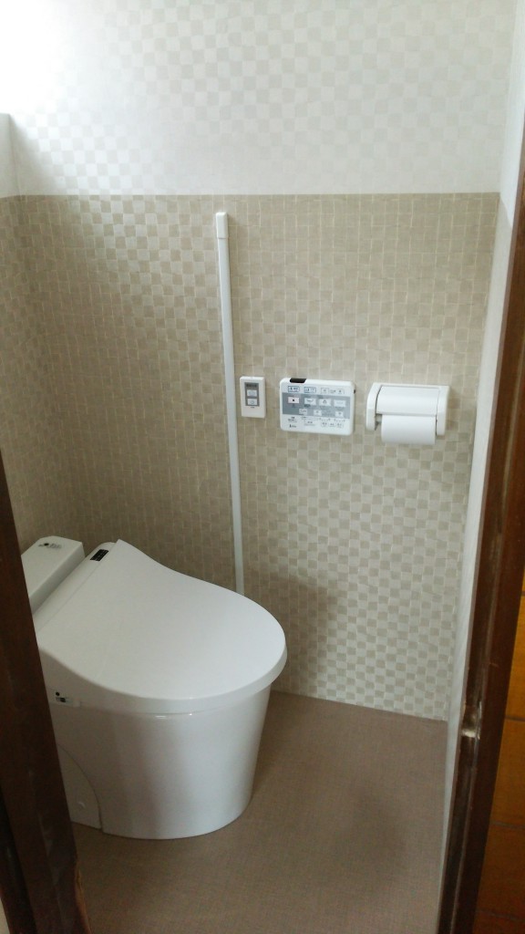 ・内装といっても、トイレだけでも大きく変わります。今回の内装はお客様の要望で上下同じ柄で色違いの和風テイストでご提案いたしました。